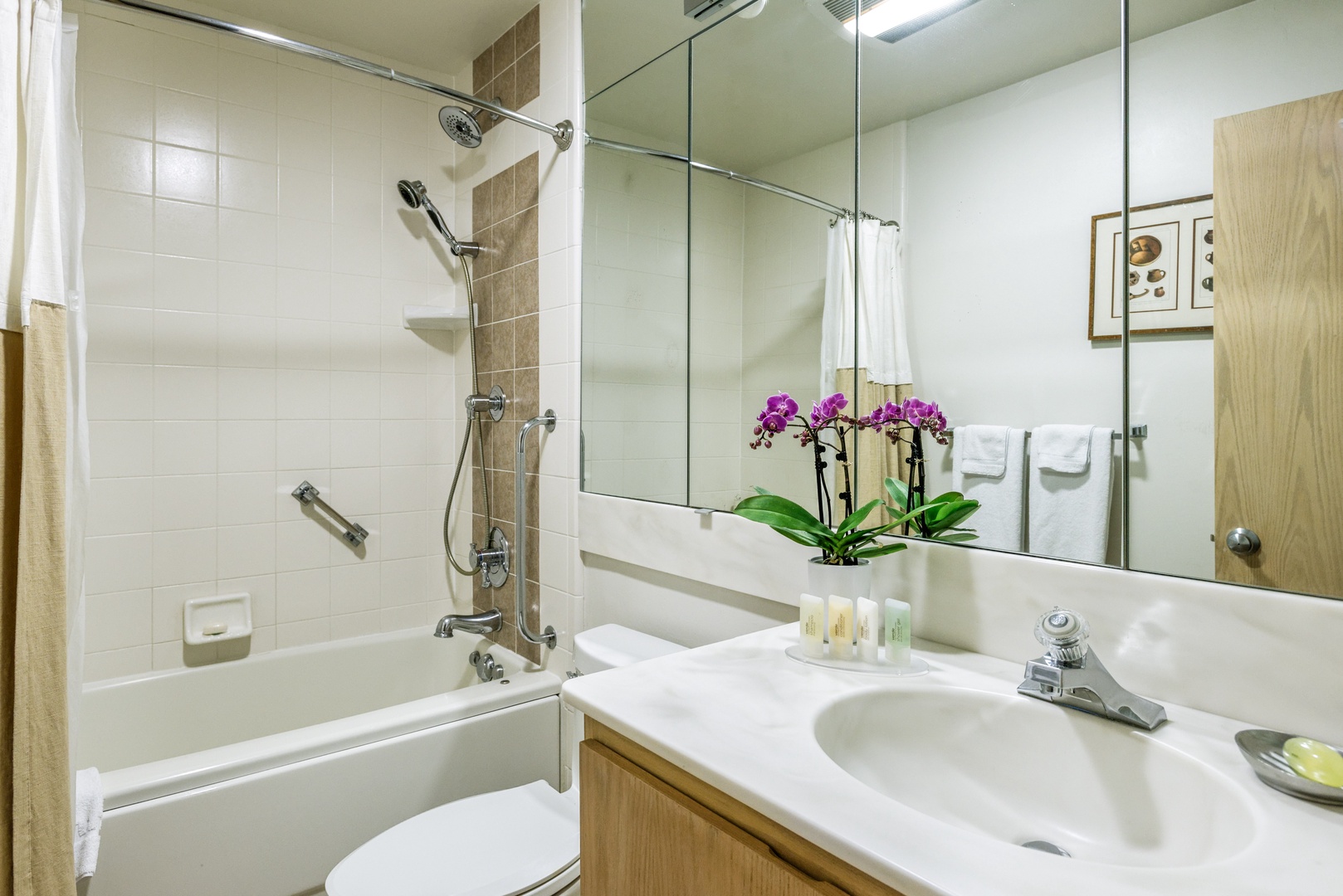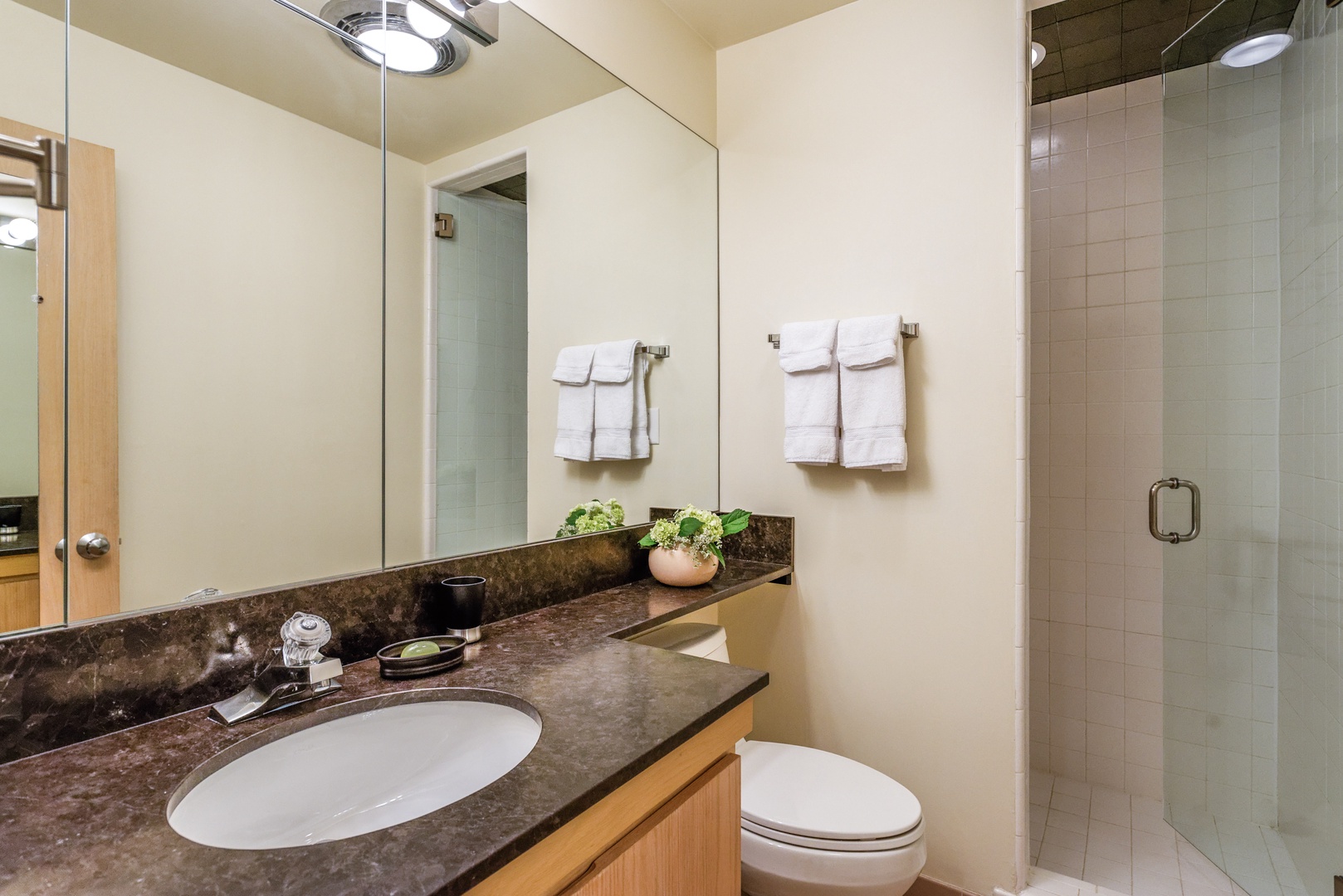 Upstairs, you’ll find two bedrooms, each with a king bed and ensuite bathroom, both offering stunning views. Downstairs are two additional bedrooms—one with a king bed and ensuite bath, and another featuring two twin beds plus a convertible sleeper sofa, with a separate full bathroom nearby. The condo comfortably accommodates up to eight guests. A laundry area and central air conditioning ensure added comfort and convenience, especially during the warmer months.