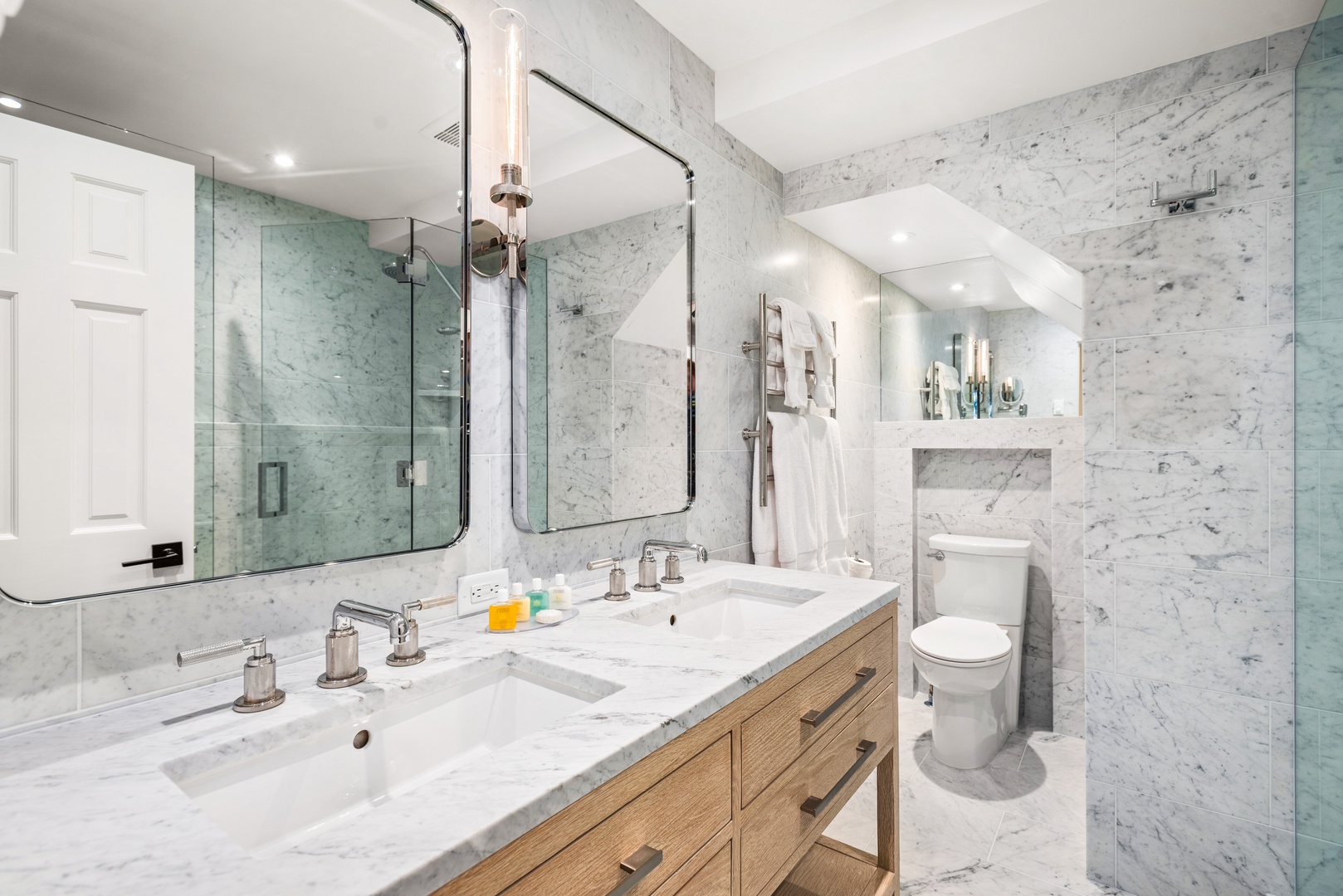 The lower level includes two more bedrooms: one with a king bed and another with two twin beds, each with its own bathroom. The twin beds can be converted into a king upon request. Every bedroom and the living room are equipped with portable air conditioning units for added comfort year-round.